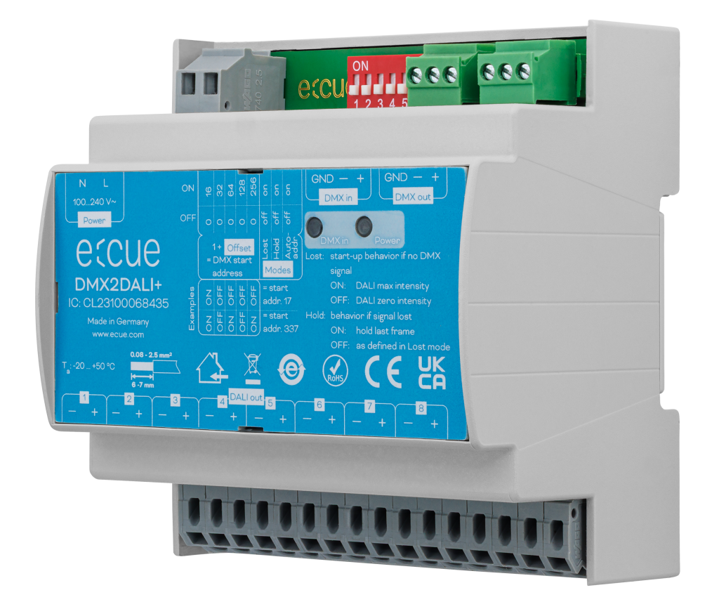 8 DALI Broadcast-Ausgänge, die von 8 DMX512Ch gesteuert werden. Bis zu 64 DALI-Vorschaltgeräte pro Ausgang (= 512 Vorschaltgeräte insgesamt), Einfache 100 bis 240 V AC Versorgungsspannung Strom- und DMX-Status-LEDs Manuelle und automatische DMX-Adressierungsmodi DIP-Schalter für Konfiguration und manuellen Adressierungsmodus (Offset) Konfigurierbarer DALI-Ausgang bei DMX-Signalverlust Montage auf DIN-Schiene Als flexibler Konverter von DMX-Signalen in DALI ist […]