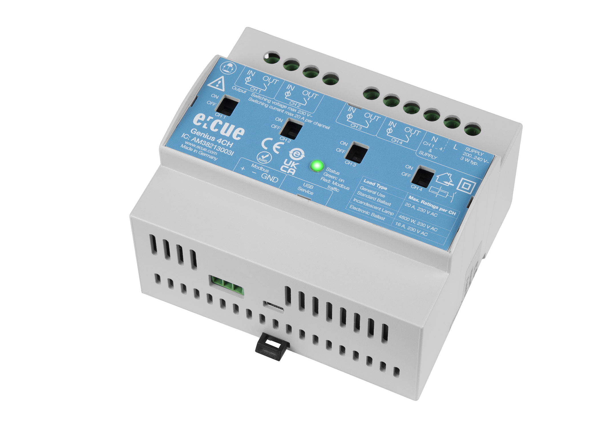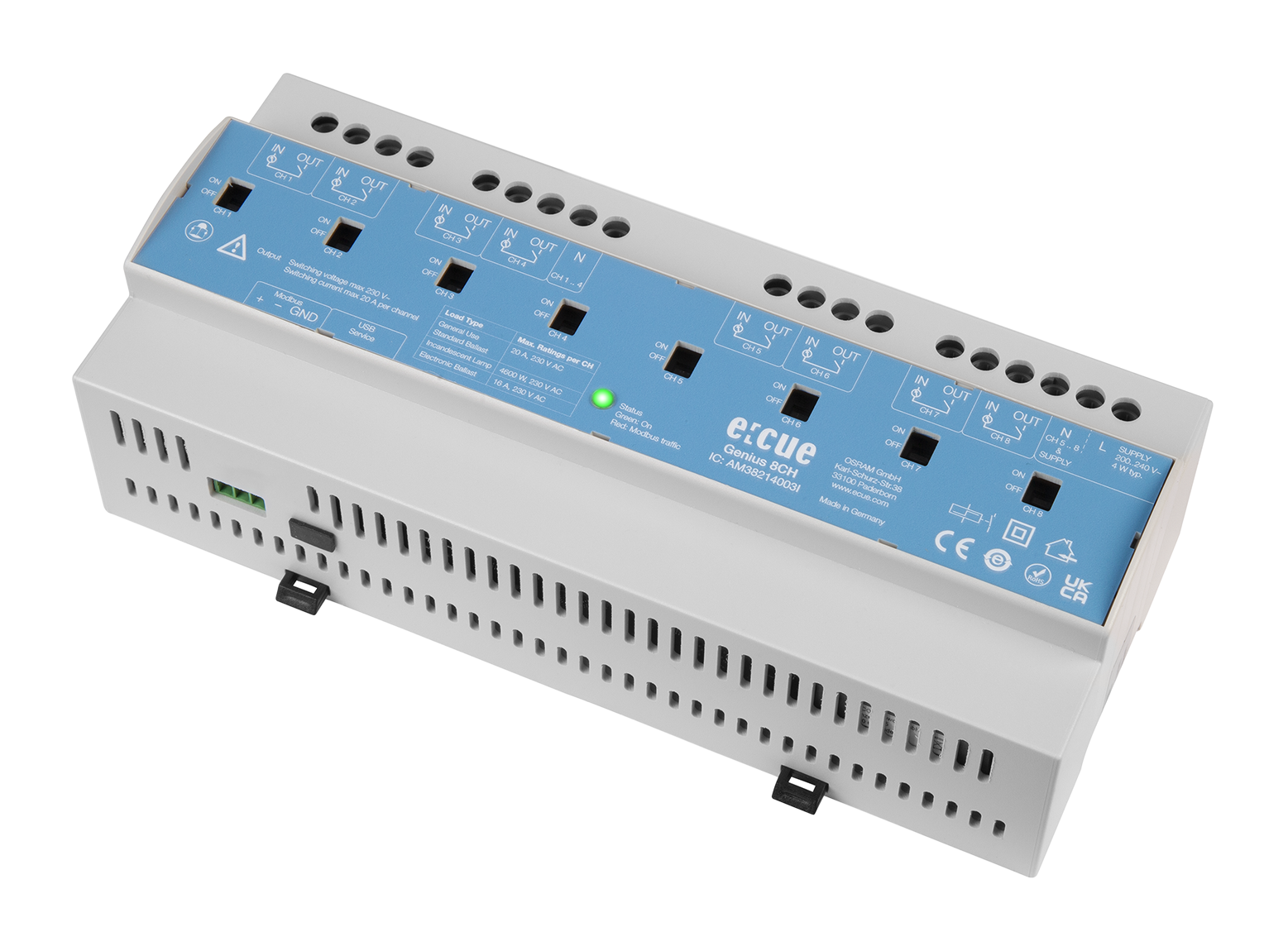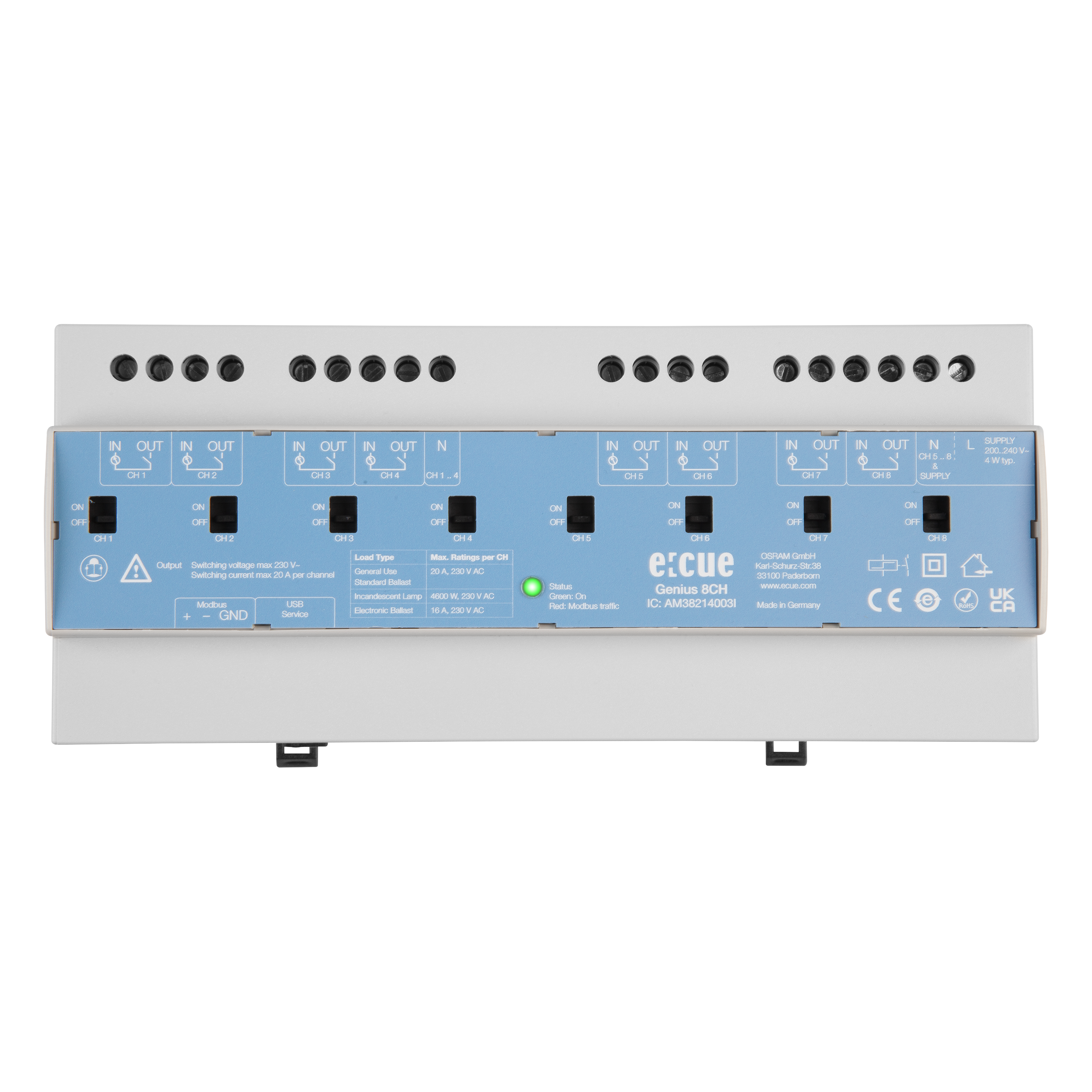 The Genius is a relay controller and energy meter that combines measuring and switching load in a single device. Communication with any third party system is made via the Modbus RTU / ASCII protocol at a RS-485 interface. The Genius 4CH provides four bistable relay interfaces in single-pole, single-throw configuration, accompanied by manual switches for service overrides. The Genius 8CH offers eight of them. It is a modular basic solution for controlling lighting installations. The Genius is easily mounted on standard 35 mm DIN rails, or with a key hole in the housing base on walls or on any stable vertical surface. The Node is AC line powered.