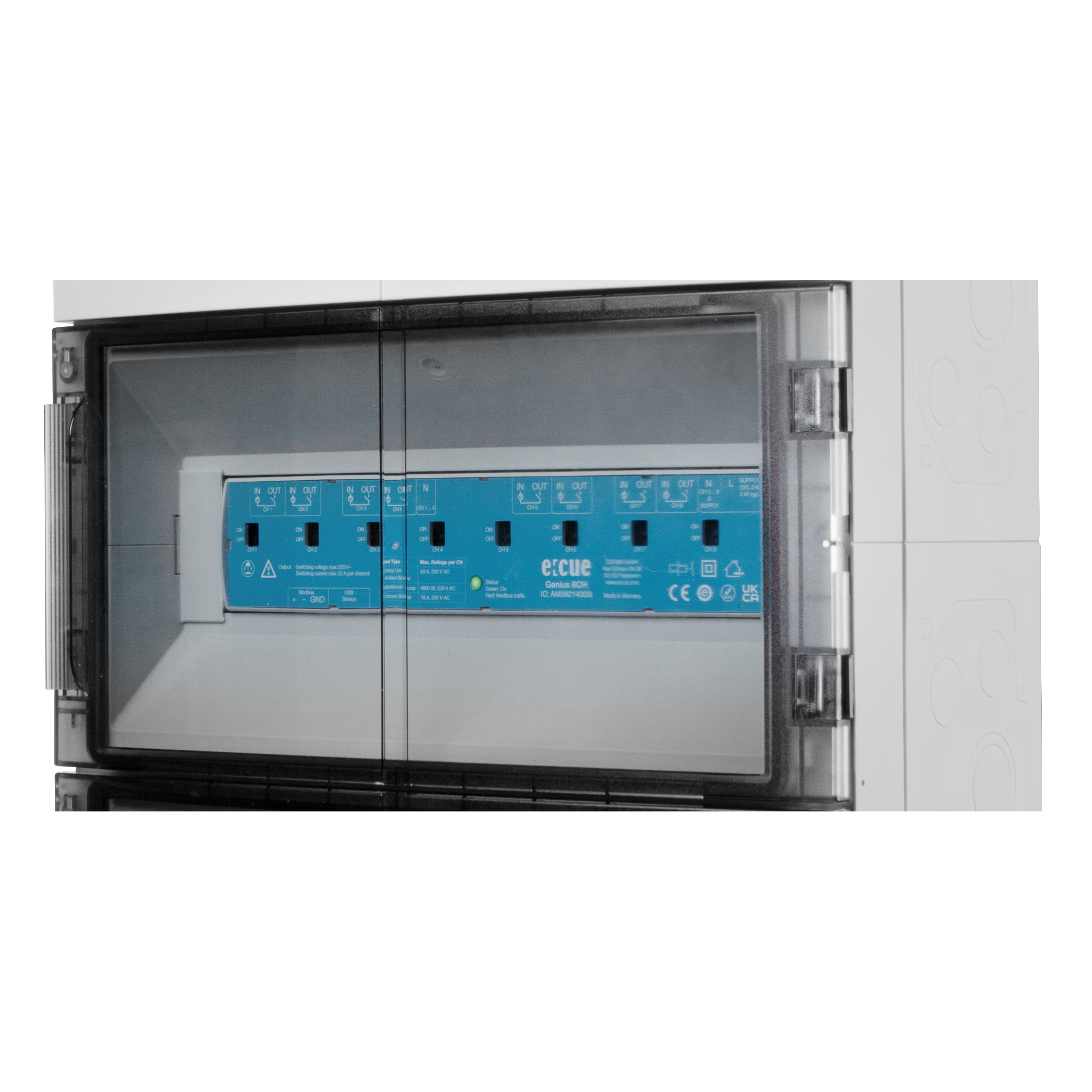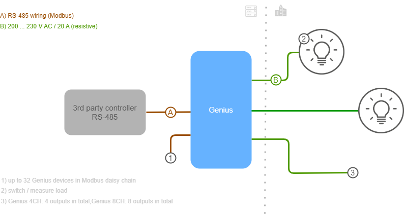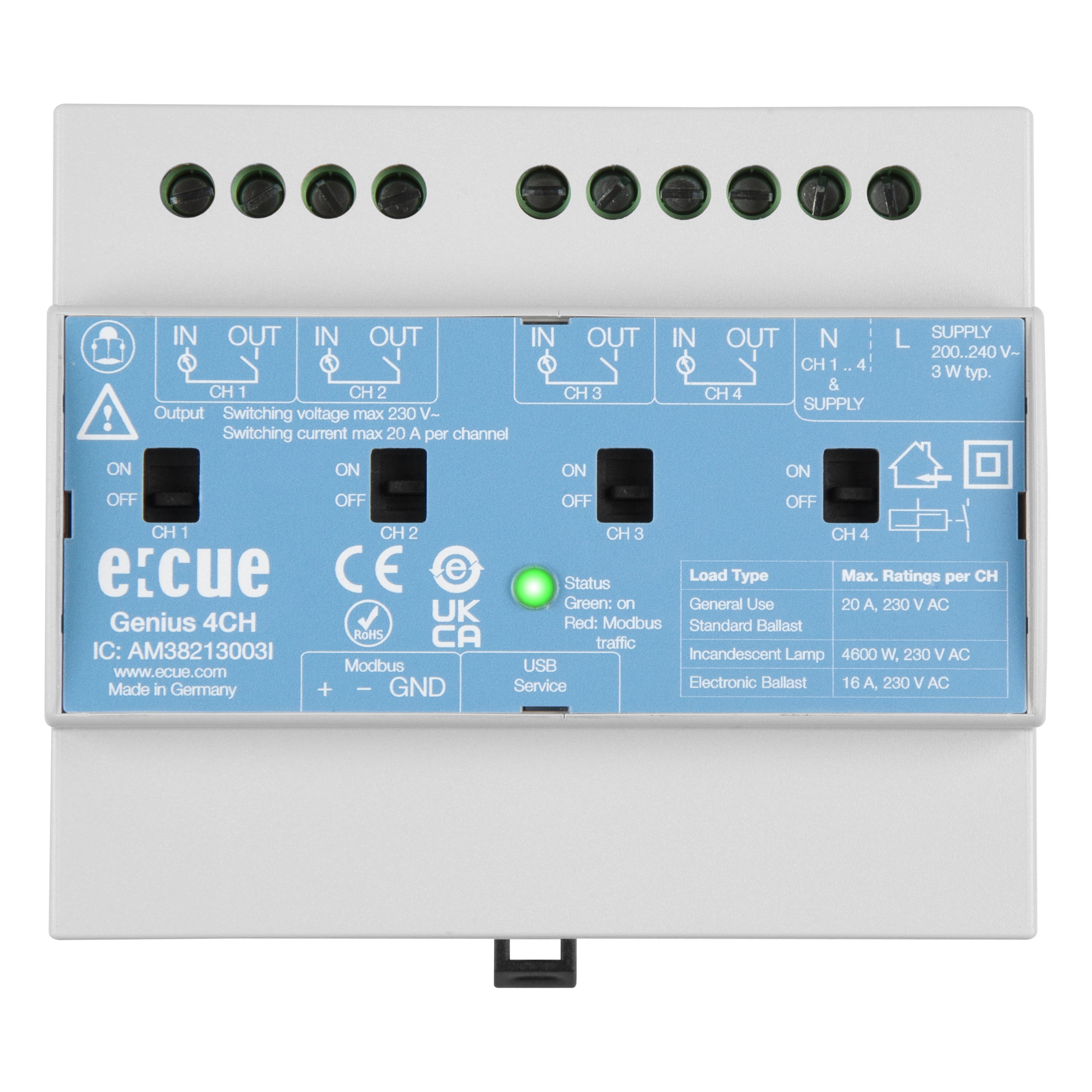 The Genius is a relay controller and energy meter that combines measuring and switching load in a single device. Communication with any third party system is made via the Modbus RTU / ASCII protocol at a RS-485 interface. The Genius 4CH provides four bistable relay interfaces in single-pole, single-throw configuration, accompanied by manual switches for service overrides. The Genius 8CH offers eight of them. It is a modular basic solution for controlling lighting installations. The Genius is easily mounted on standard 35 mm DIN rails, or with a key hole in the housing base on walls or on any stable vertical surface. The Node is AC line powered.