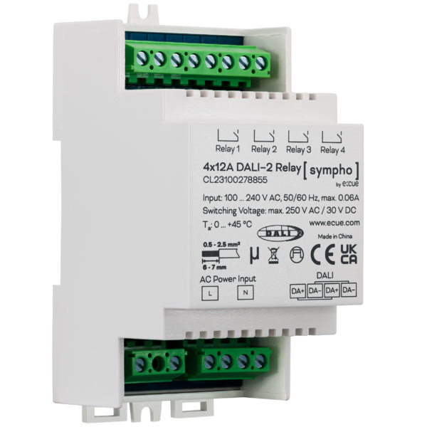 The 4-channel DALI Relay Module enables seamless integration of conventional electrical loads into DALI lighting systems. Each of the four relays (up to 12 A) can be controlled individually via DALI, allowing non-DALI devices to be easily switched on or off within the system.