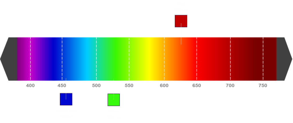 Instead of the traditional three wavelength peaks for RGB, SYMPHONY produces a broad spectrum with a flatter, even distribution of the visible wavelengths.